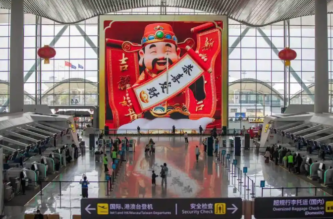 与此同时,航站楼内一系列文化活动也让旅客在旅途中提前感受到浓浓年味。T2航站楼“上新”825㎡裸眼3D大屏,《醒狮献瑞》《广货行天下》等主题画面以震撼视觉效果,成为旅客打卡首选;萌趣IP“大湾鸡”化身“新春使者”,在出发大厅与旅客互动送福。
