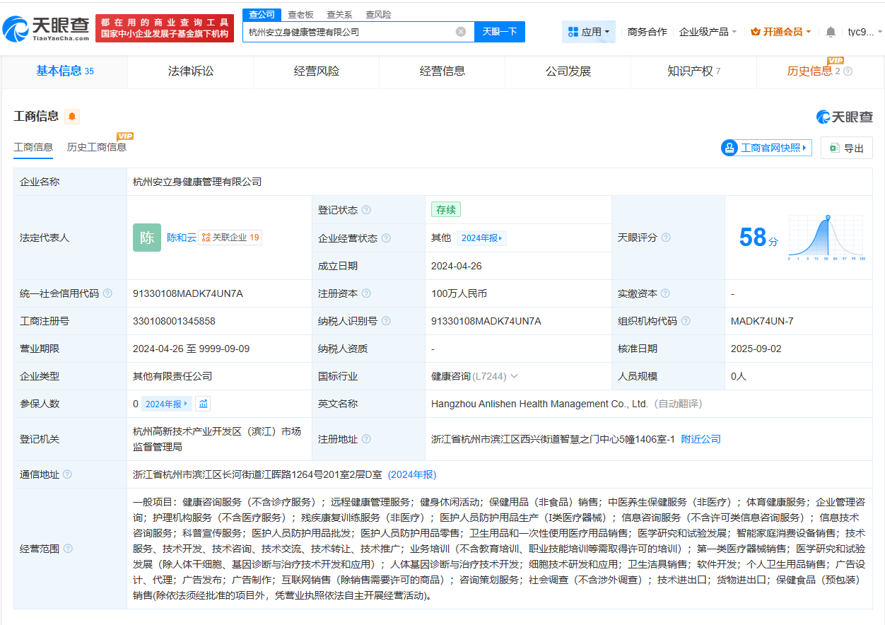天眼查App显示,杭州安立身健康管理有限公司成立于2024年4月,法定代表人为陈和云,注册资本100万人民币,经营范围包括健康咨询服务、远程健康管理服务、健身休闲活动等,由温州南霖企业管理有限公司、温州安立高企业管理合伙企业(有限合伙)、杭州脊得整大健康管理有限公司共同持股。