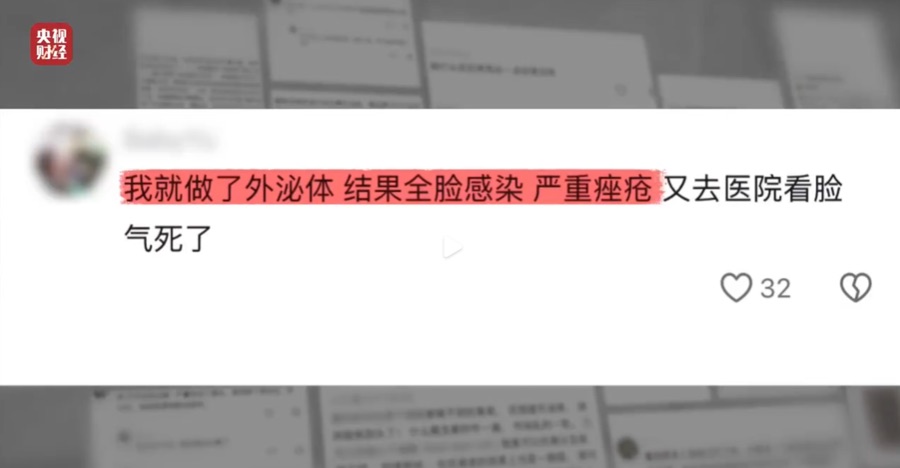 事实上,央视315晚会曝光,外泌体在医疗界和学术界,其作用机理、临床测试等多项医学程序上,尚不能明确。但在市场上已经大量套证生产、违规添加、违规销售,在医美行业广泛滥用,导致诸多消费者受到身体伤害。