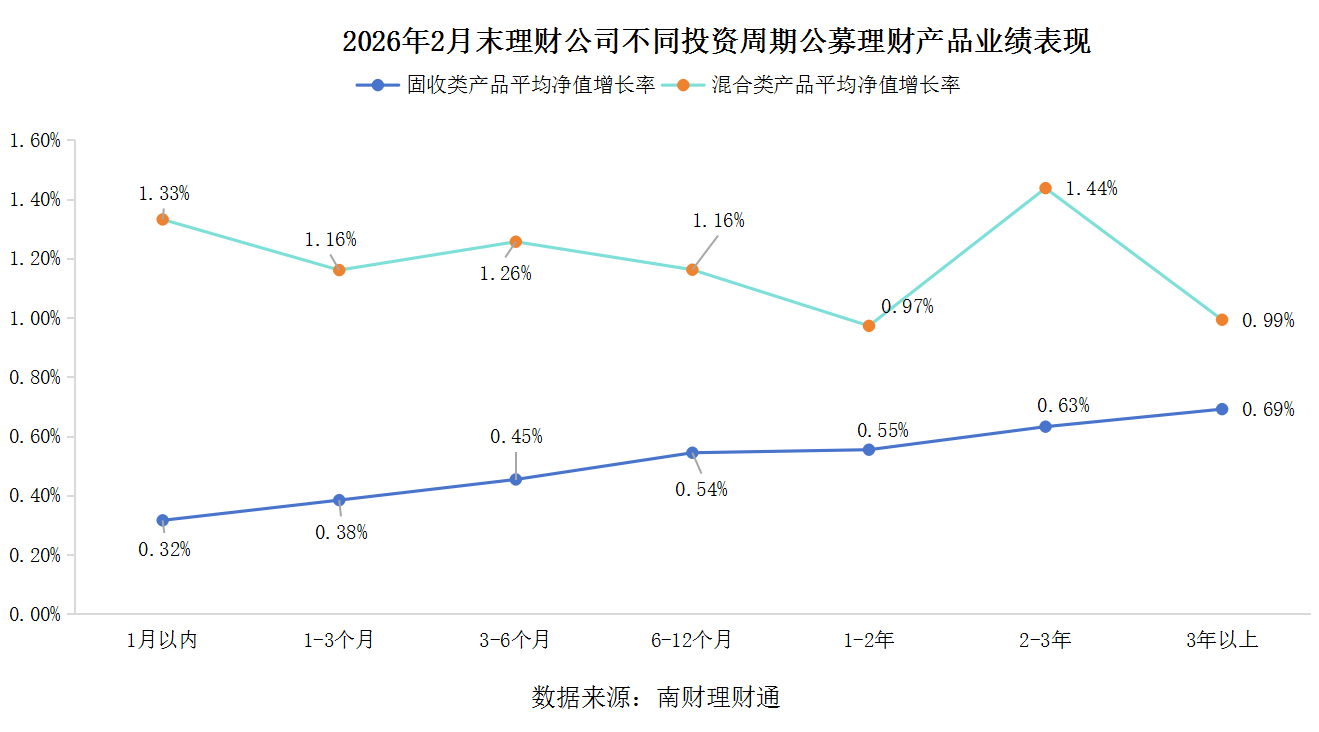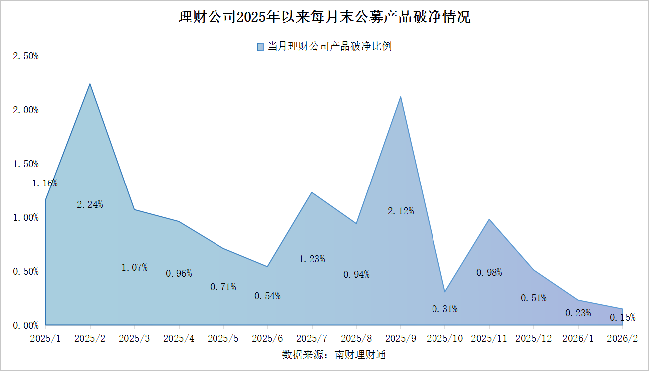 破净情况:2月末,理财产品整体破净率降至0.15%,较1月末收窄8个基点,创2025年以来新低。权益类产品破净率大幅回落至19.51%;混合类及固收类产品破净率均小幅下行,截至2月末分别为1.45%和0.05%。