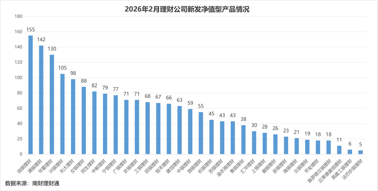 产品数量:南财理财通数据显示,2026年2月,32家理财公司合计发行了1850只理财产品(同一产品登记编码下不同份额合并计算),环比1月份的2172只下降了14.83%,猜测是受2月份春节假期影响。发行数量位居前三的理财公司分别为信银理财、浦银理财和华夏理财,发行数量分别为155只、142只和130只。