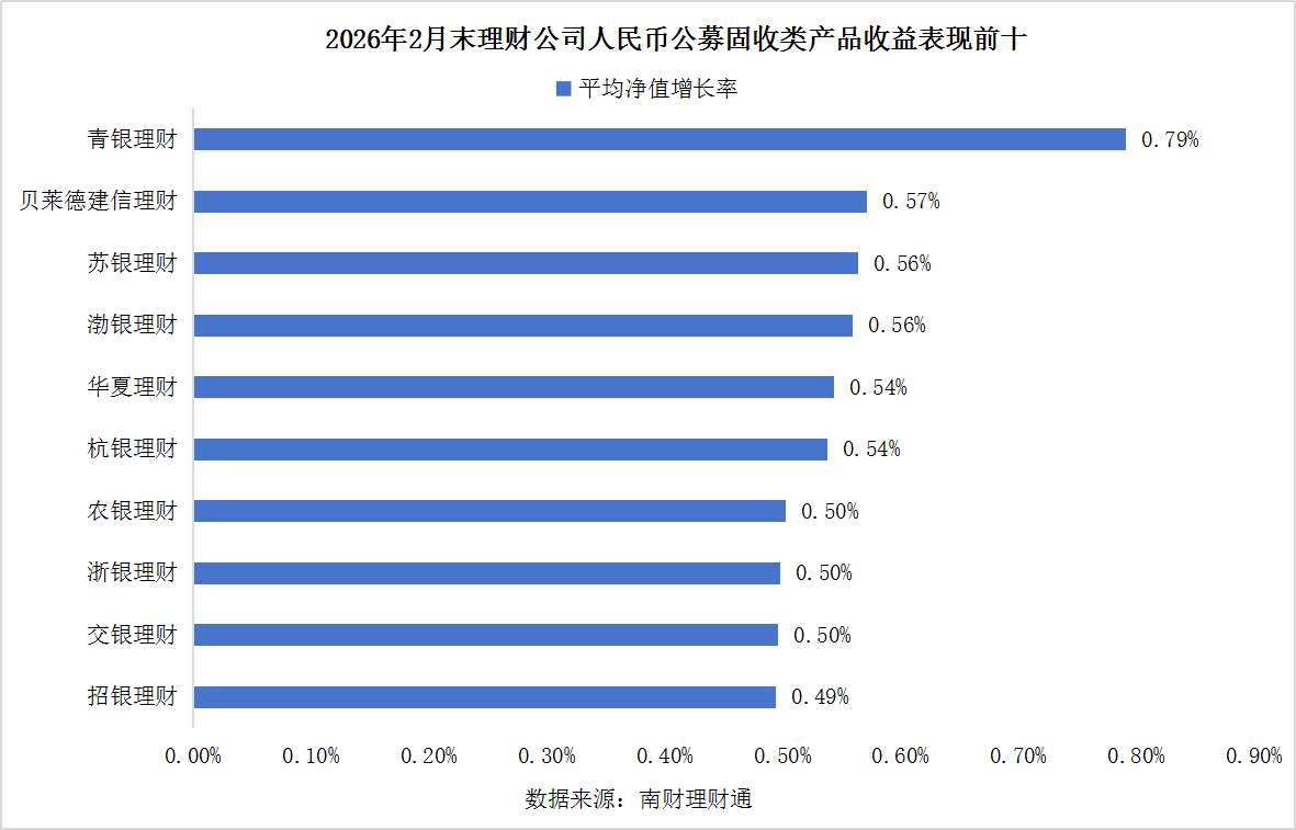 人民币公募固收类产品收益方面,青银理财延续开年以来领先优势,今年前两个月平均净值增长率为0.79%;贝莱德建信理财为0.57%。此外,苏银理财、渤银理财等八家机构固收类产品平均净值增长率均突破0.50%。