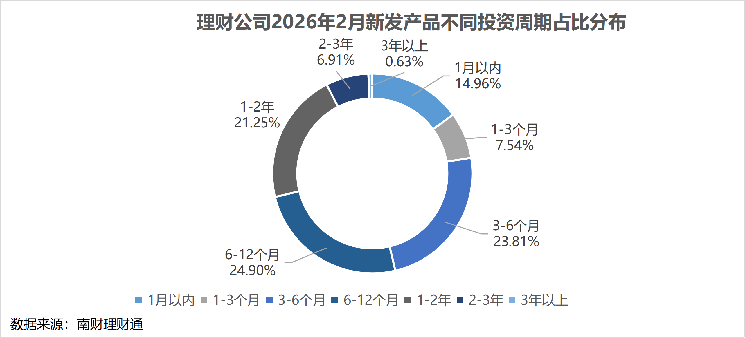 从风险等级上看,2月新发产品风险等级占比呈现两头高,中间低的变化趋势,一级(低风险)产品占比、四级(中高风险)产品、五级(高风险)产品占比有所提升,其中五级(高风险)产品占比环比提高了2.23个百分点。相比之下,二级(中低风险)产品和三级(中风险)产品占比有所下降,其中三级(中风险)产品占比环比下降了2.06个百分点。