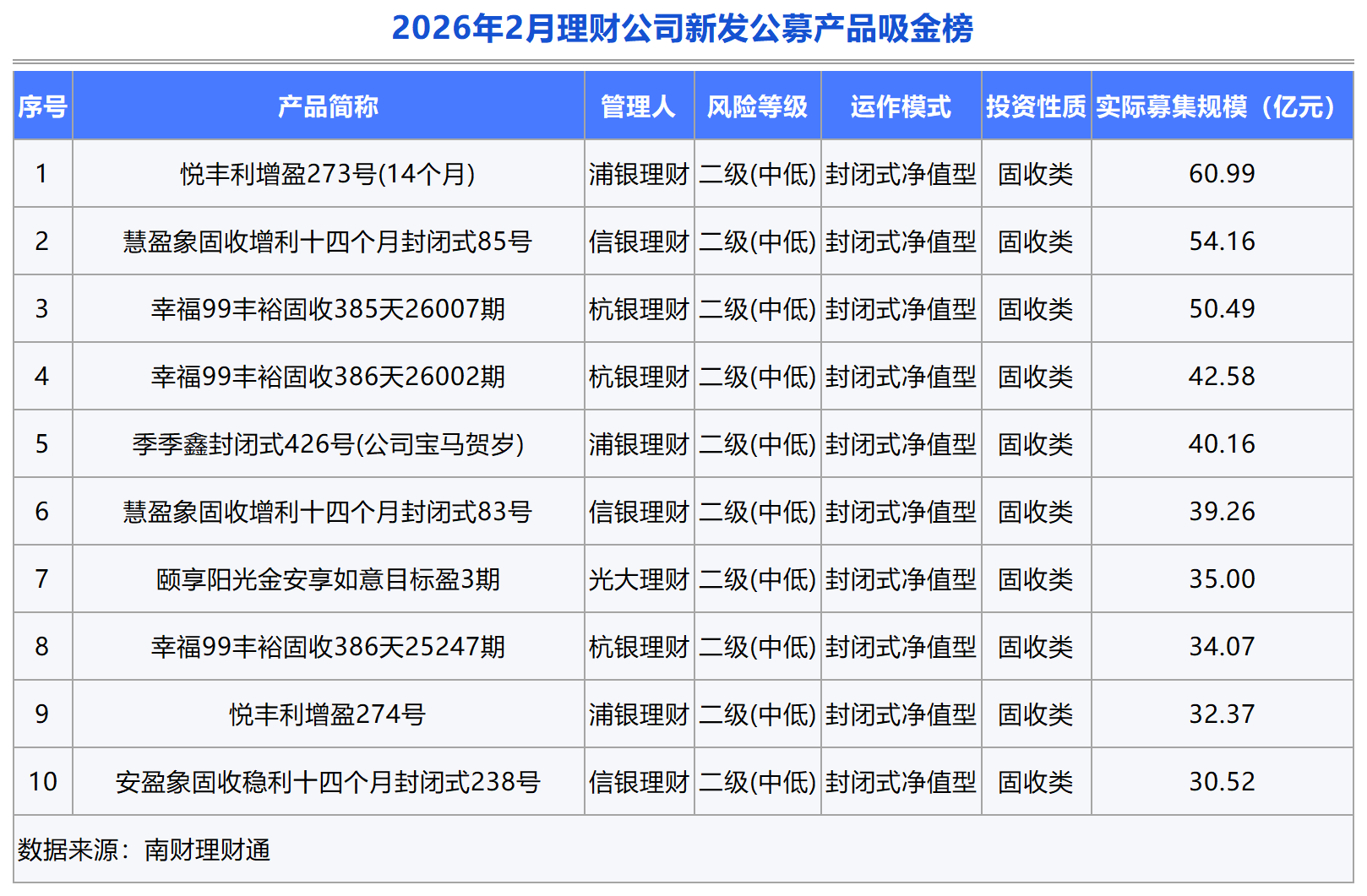 不过,从募集规模榜单前十名来看,2月份单品吸金量有明显提高,有3只产品募集规模超过50亿元,其中浦银理财“悦丰利增盈273号(14个月)”夺得榜单冠军,募集规模达到60.99亿元。值得注意的是,浦银理财已连续两个月(2026年1月份、2月份)夺得吸金榜冠军。信银理财保持一贯的产品吸金能力,旗下两个明星系列“慧盈象固收增利”和“安盈象固收稳利”有3只产品进入榜单前十。此外,杭银理财“幸福99丰裕固收”系列产品也上榜3只产品,表现亮眼。