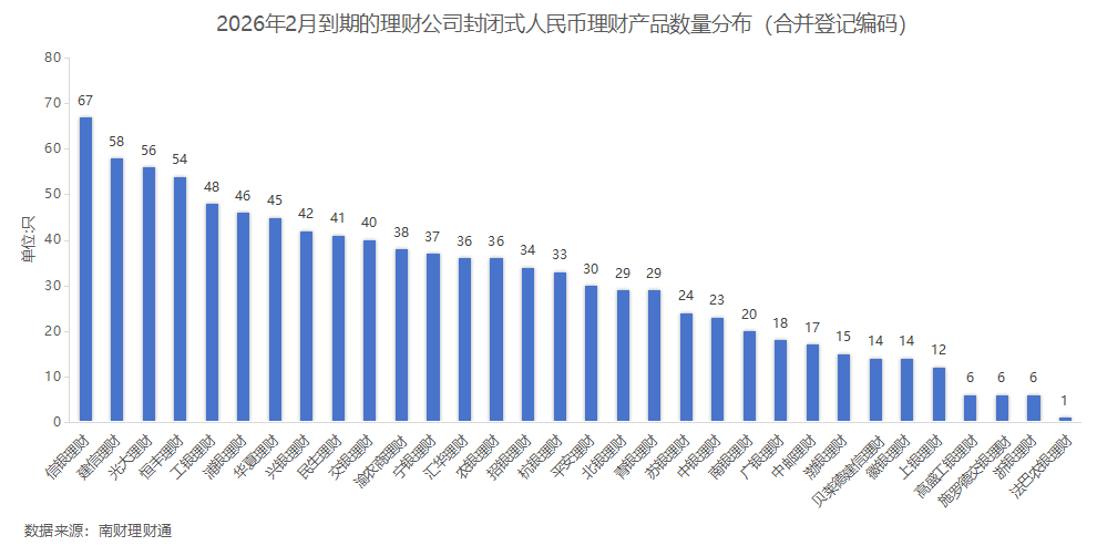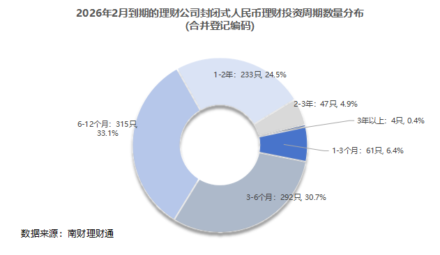 产品数量:据南财理财通数据,2026年2月,32家理财公司合计有975只(按登记编码核算)封闭式人民币理财产品到期。分投资性质看,固收类、混合类分别有945只、22只产品到期,权益类、商品及金融衍生品类理财各有5只、3只到期。分募集方式看,公募型产品数量874只,私募型产品101只。信银理财、建信理财和光大理财到期产品数量位居前三。