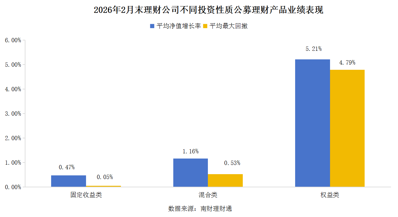 产品收益:2026年前两个月,A股震荡上行。权益类产品、混合类产品以及固收类产品今年前两个月平均净值增长率分别为5.21%、1.16%和0.47%;固收类产品依旧维持不超过0.1%的平均最大回撤。