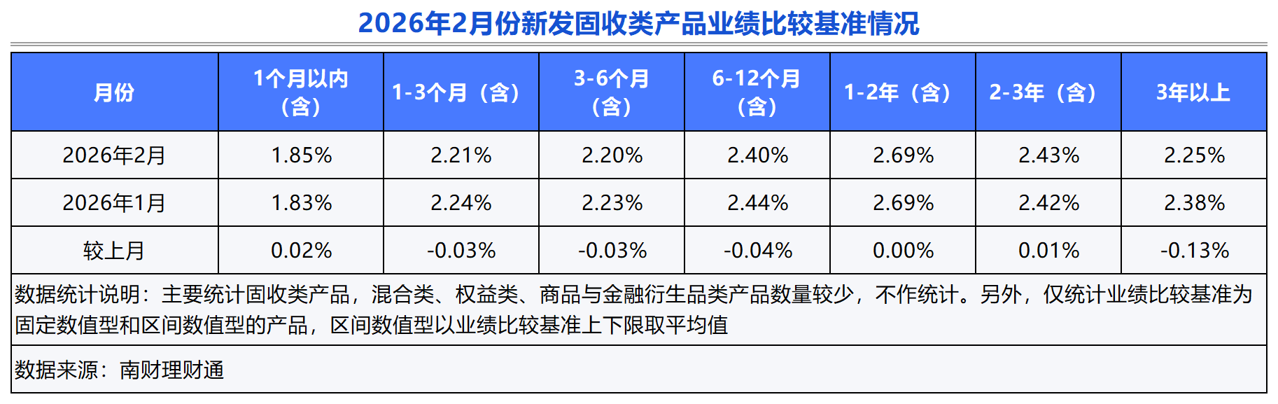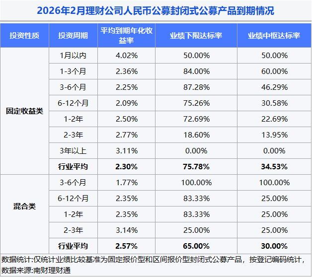 到期情况:2026年2月,32家理财公司合计有975只(按登记编码核算)封闭式人民币理财产品到期。达标率方面,到期产品业绩下限达标率为75.25%,业绩中枢达标率为34.35%。从到期产品业绩水平看,固定收益类封闭式人民币公募产品年化收益率均值为2.30%,混合类产品为2.57%。