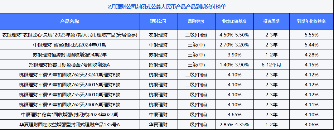 农银理财"农银匠心·灵珑"2023年第7期人民币理财产品(安居悦享)和中银理财“智富(封闭式)2024年01期”两只产品到期年化收益率超5%,位列前二。