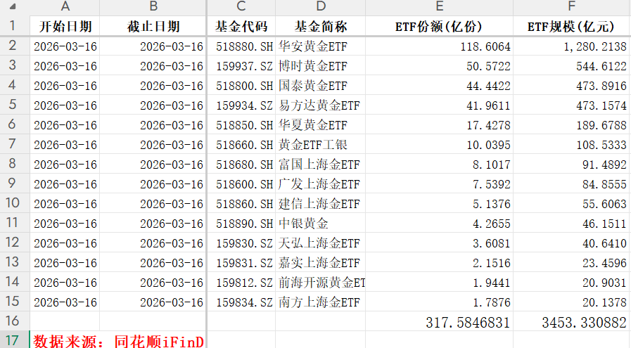 今年以来A股投资者对于黄金ETF的热情一直高涨,根据同花顺统计,截至3月15日,目前在A股上市的黄金ETF有14只,最新的份额为317.6亿份,市值高达3453.3亿元,相比此前一周增加了5.03亿份,相比上个月增加19亿份,相比年初增加了63.4亿份。其中华安黄金ETF规模最大,最新市值达到了1280.2亿元,博时黄金ETF和国泰黄金ETF分列二三名,前者规模为544.6亿元和473.9亿元。