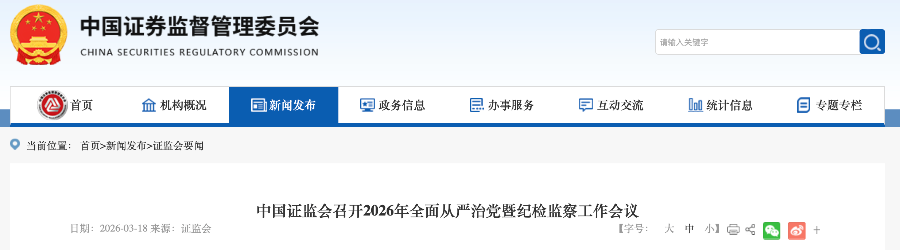 21世纪经济报道记者崔文静 3月17日,证监会召开2026年全面从严治党暨纪检监察工作会议。作为“十五五”开局之年的一次重要内部会议,证监会党委书记、主席吴清对2026年系统全面从严治党工作作出具体部署,中央纪委国家监委驻证监会纪检监察组组长樊大志就纪检监察工作提出明确要求。
