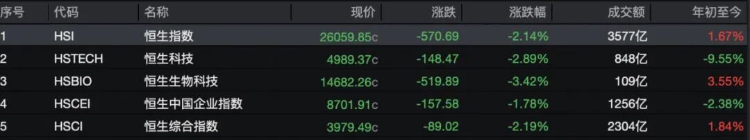 3月2日,受中东局势影响,港股三大指数集体大跌。其中,恒生指数收跌2.14%,报26059.85点,险守26000点;恒生科技指数收跌2.89%,回落至5000点下方;恒生中国企业指数收跌1.78%,报8701.91点。 全日大市成交额为3577亿港元,南向资金净买入162.14亿港元。