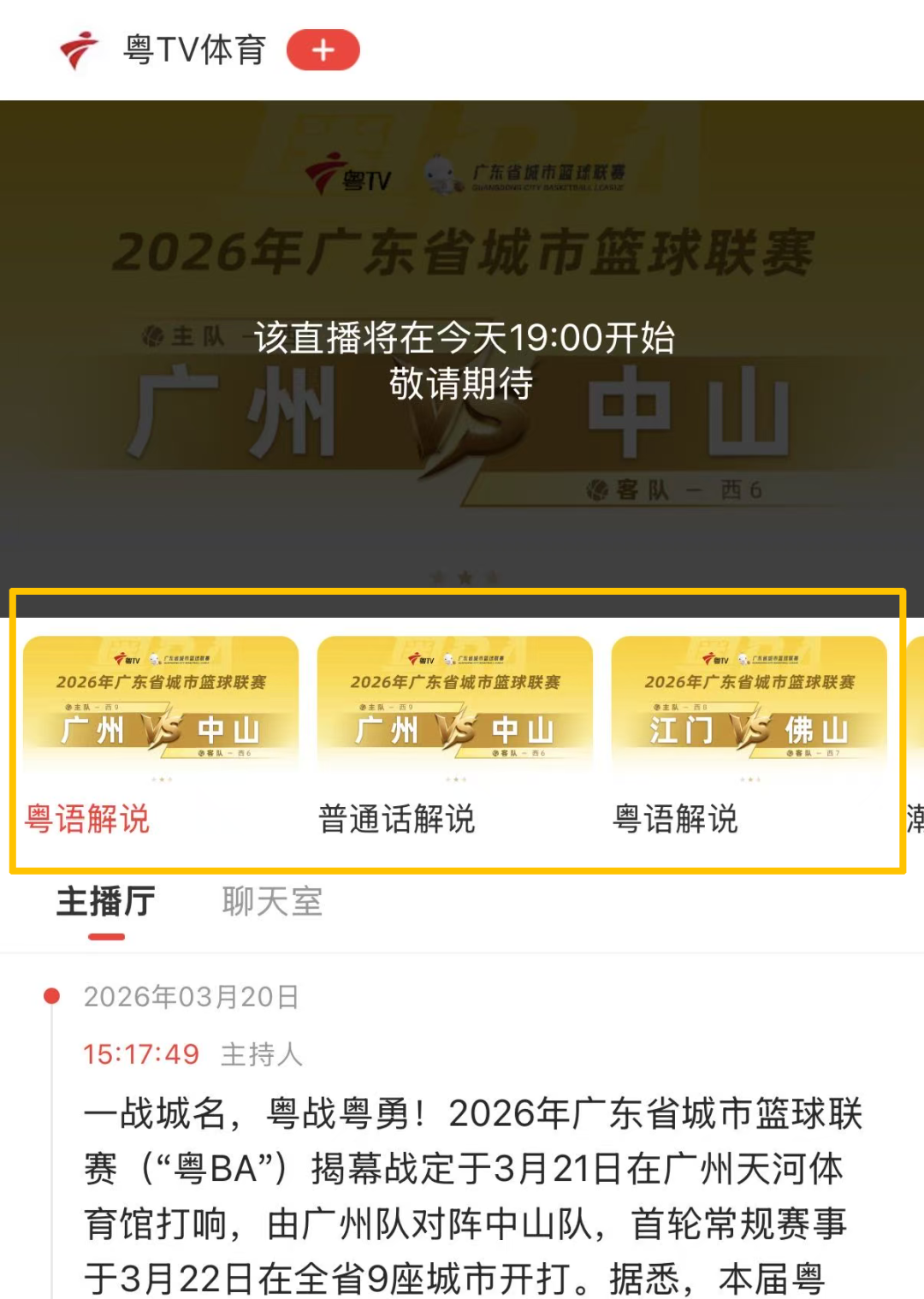 在“粤TV”APP观看时,直播间可一键切换普通话或粤语解说,用方言观赛更对味!
