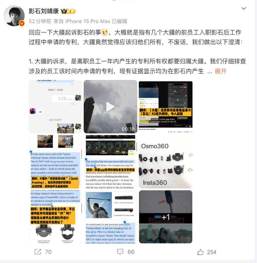 (影石创新创始人刘靖康在社交媒体上回应)