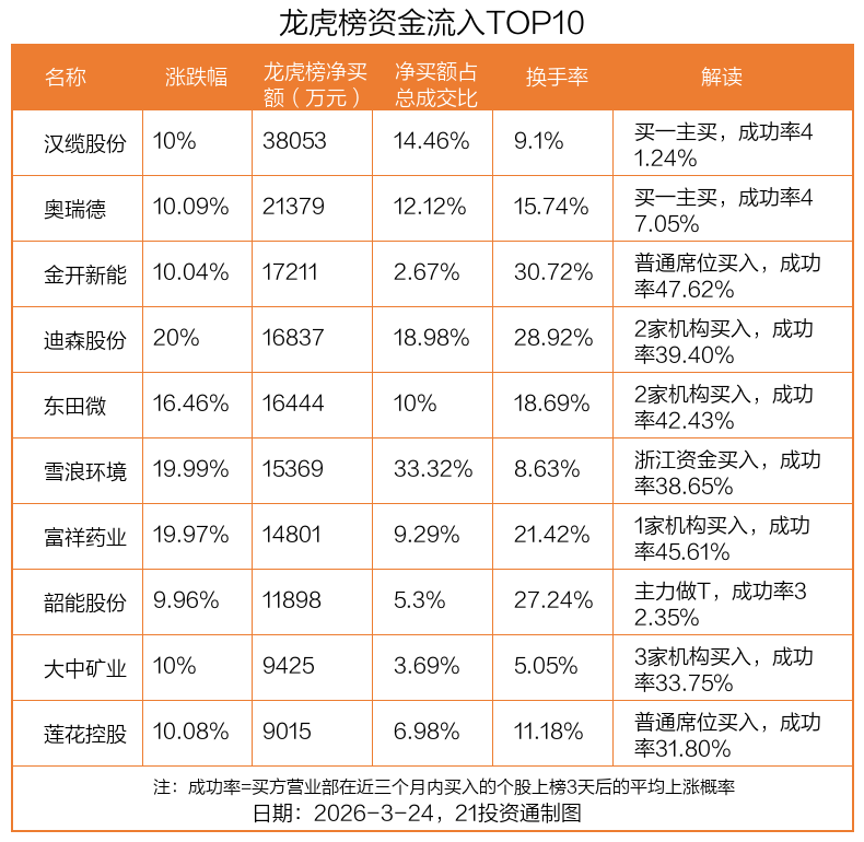 3月24日,上证指数上涨1.78%,深证成指上涨1.43%,创业板指上涨0.5%。盘后龙虎榜数据显示,共有56只个股因当日异动登上龙虎榜,资金净流入最多的是汉缆股份(002498.SZ),达3.81亿元。