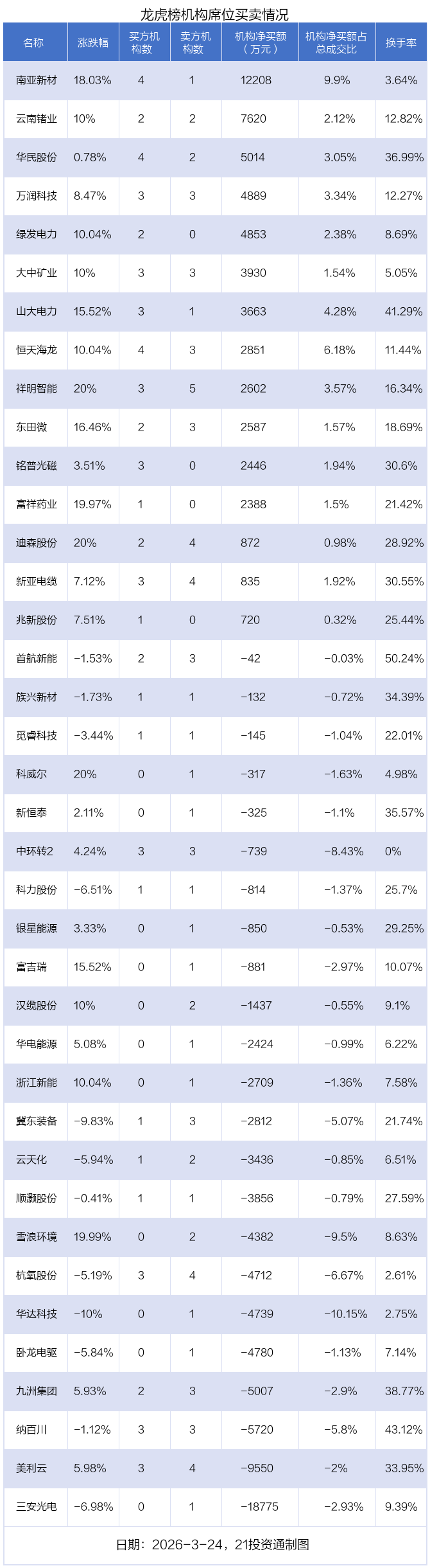 3月24日,38只个股龙虎榜出现了机构的身影,机构合计净卖出2.11亿元。具体来看,机构净买入15股,净卖出23股。