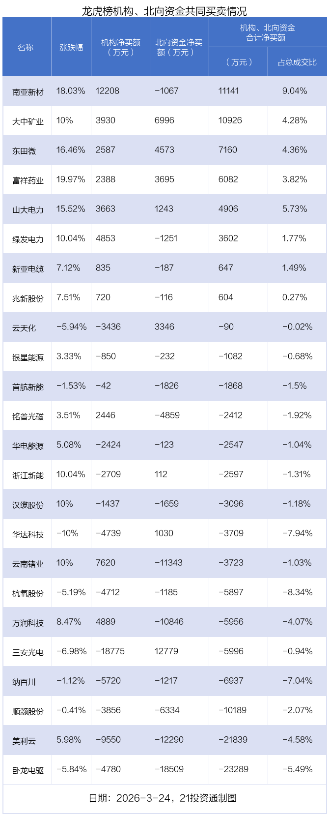 值得注意的是,机构和北向资金共同净买入了大中矿业、东田微、富祥药业、山大电力等4股;共同净卖出了华电能源、银星能源、杭氧股份、纳百川、汉缆股份、首航新能、顺灏股份、美利云、卧龙电驱等9股;在三安光电,云天化,华达科技,浙江新能,兆新股份,新亚电缆,南亚新材,绿发电力,铭普光磁,万润科技,云南锗业上出现分歧,机构净卖出三安光电1.88亿元,北向资金净买入1.28亿元;机构净卖出云天化3435.84万元,北向资金净买入3346.1万元;机构净卖出华达科技4738.5万元,北向资金净买入1029.78万元;机构净卖出浙江新能2709.34万元,北向资金净买入112.12万元;机构净买入兆新股份719.93万元,北向资金净卖出116.11万元;机构净买入新亚电缆834.54万元,北向资金净卖出187.46万元;机构净买入南亚新材1.22亿元,北向资金净卖出1067.18万元;机构净买入绿发电力4853.19万元,北向资金净卖出1251.13万元;机构净买入铭普光磁2446.37万元,北向资金净卖出4858.75万元;机构净买入万润科技4889.32万元,北向资金净卖出1.08亿元;机构净买入云南锗业7620.41万元,北向资金净卖出1.13亿元。