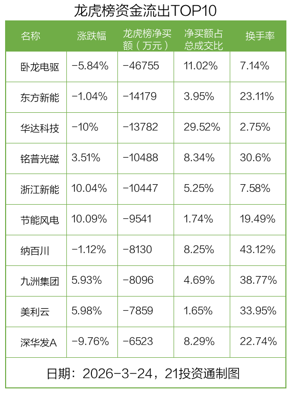 而龙虎榜中资金净流出最多的是卧龙电驱(600580.SH),被净卖出为4.68亿元,占总成交金额的11.02%。卧龙电驱收盘下跌5.84%,换手率为7.14%。