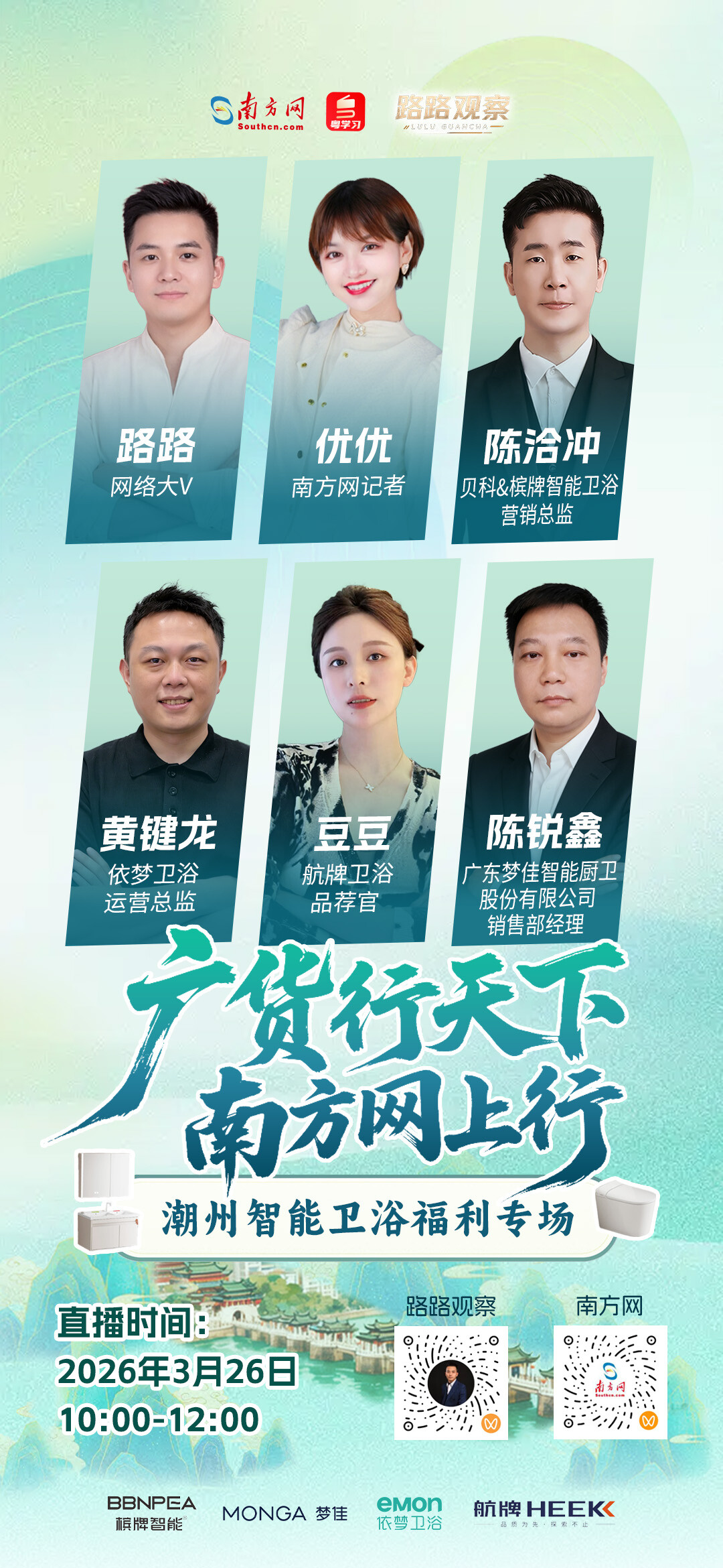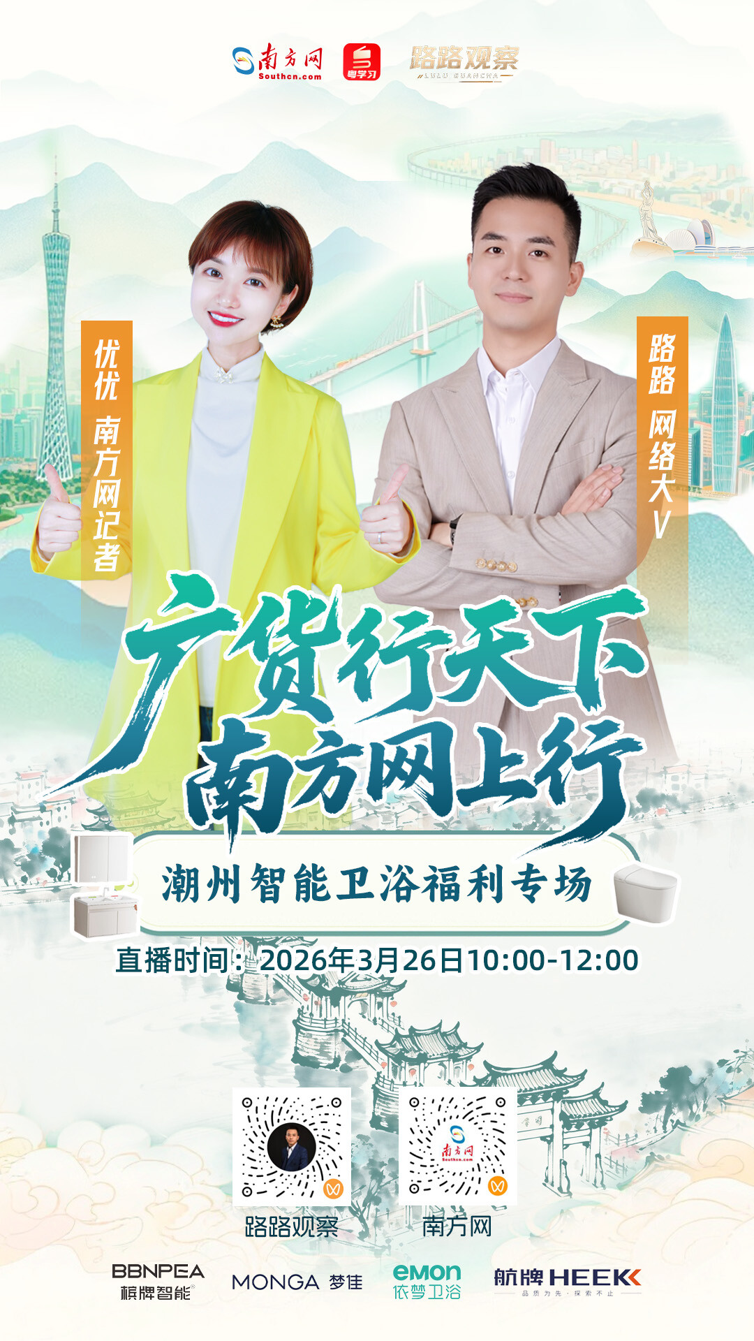 3月26日10时,南方网“广货行天下 南方网上行”直播专场将从2026潮安智能卫浴产业大会现场出发,用镜头带你领略“中国瓷都”的硬核实力,让我们共同见证“中国瓷都”潮州的品牌跃迁,一起感受“广货”智造的匠心品质。