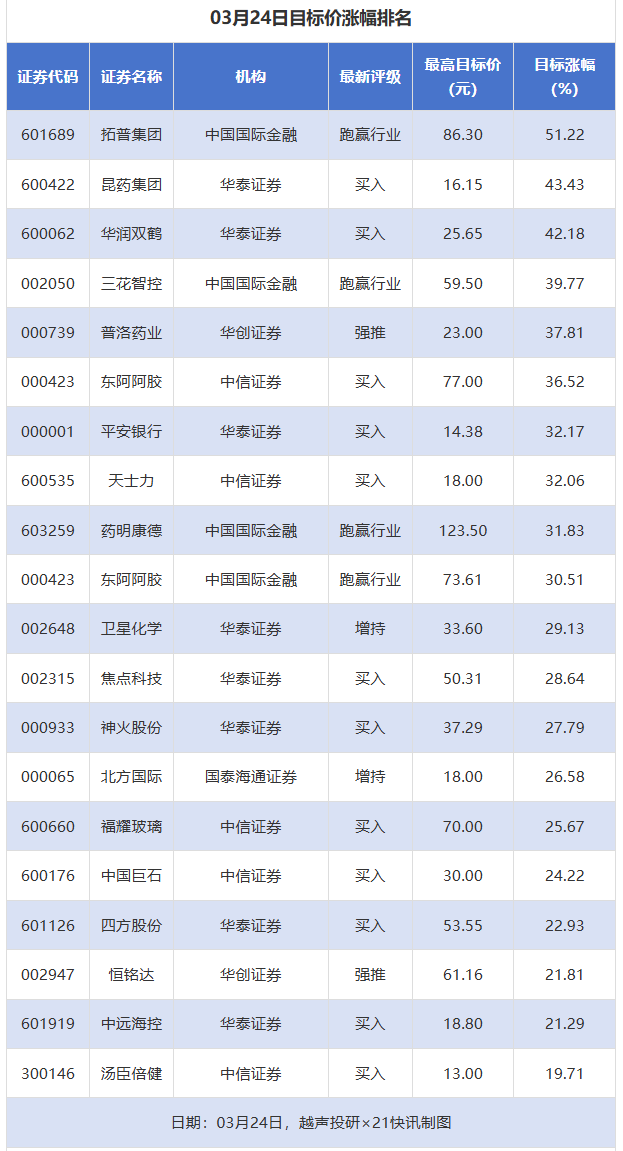 越声投研数据显示,3月24日,券商给予上市公司目标价共30次,按最新收盘价计算,目标价涨幅排名居前的公司有拓普集团、昆药集团、华润双鹤,目标价涨幅分别为51.22%、43.43%、42.18%,分别属于汽车零部件、中药、化学制药行业。