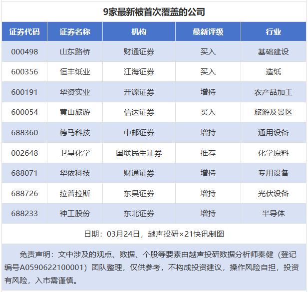 首次覆盖方面,3月24日券商共给出了9次首次覆盖,其中山东路桥获得财通证券给予“买入”评级,恒丰纸业获得江海证券给予“买入”评级,华资实业获得开源证券给予“增持”评级,黄山旅游获得信达证券给予“买入”评级,德马科技获得中邮证券给予“增持”评级。