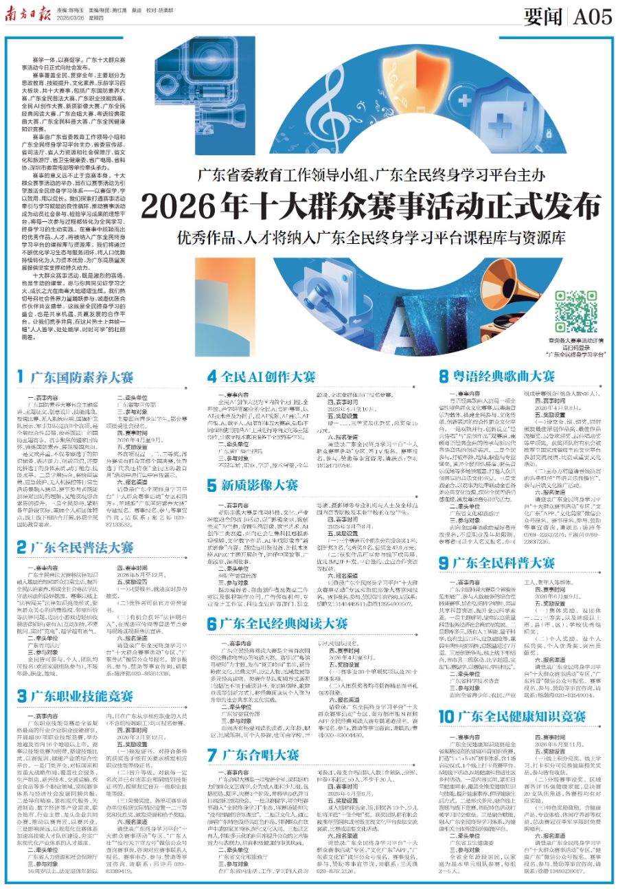 原标题:广东省委教育工作领导小组、广东全民终身学习平台主办 2026年十大群众赛事活动正式发布 优秀作品、人才将纳入广东全民终身学习平台课程库与资源库