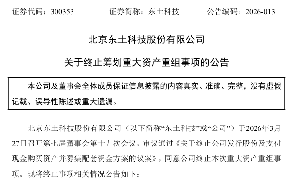 3月27日晚间,东土科技(300353)公告称,公司于2026年3月27日召开第七届董事会第十九次会议,审议通过《关于终止公司发行股份及支付现金购买资产并募集配套资金方案的议案》,同意公司终止本次重大资产重组事项。