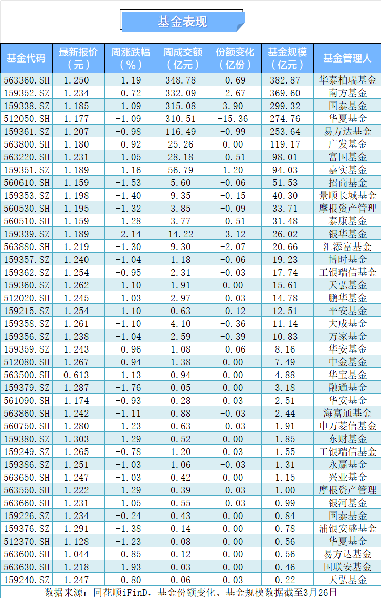 本周40只中证A500ETF再度全线下跌,银华的A500ETF跌超2%领跌,基金总规模已跌破2300亿元,A500ETF华泰柏瑞、A500ETF南方、中证A500ETF国泰三只基金规模居前,分别为382.87亿元、369.60亿元、299.32亿元。