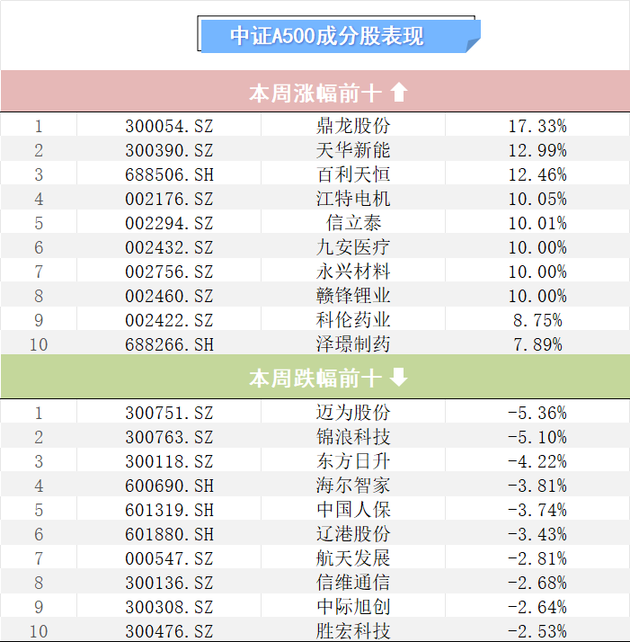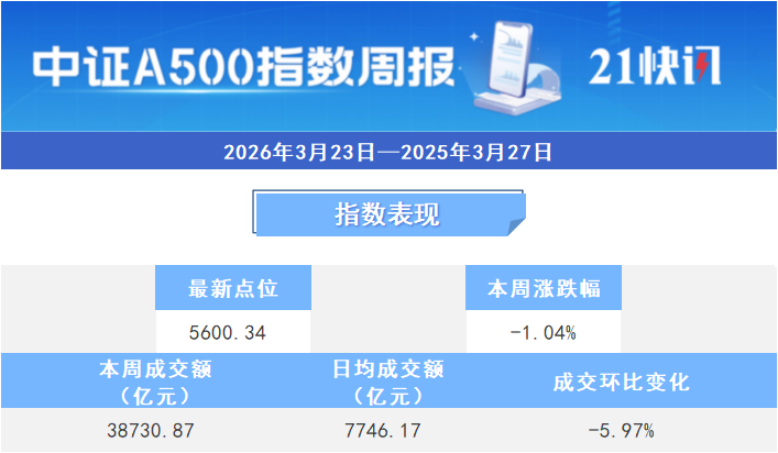 本周中证A500指数下跌1.04%,截至3月27日收盘,报5600.34点。本周日均平均成交额为7746.17亿元,单日成交额环比下降5.97%。