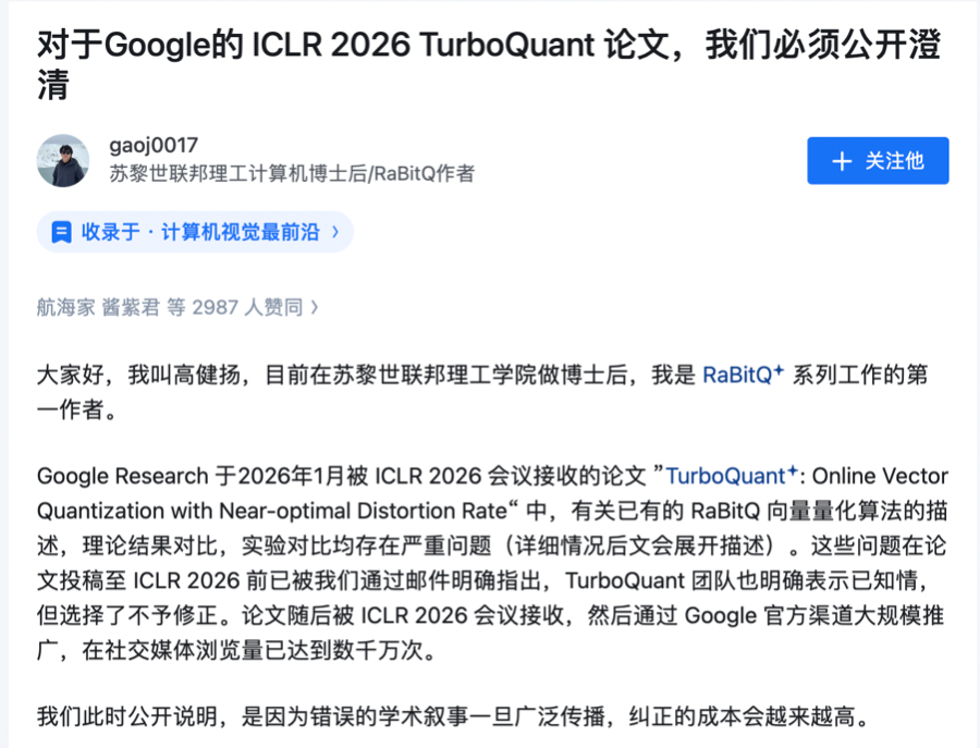 Google Research近日发布AI压缩算法论文TurboQuant遭到学术不端指控。该论文发布后24小时内浏览量破千万,存储芯片股当天集体收跌。苏黎世联邦理工学院博士后、向量量化算法RaBitQ的第一作者高健扬近日在知乎发出公开澄清信,指出TurboQuant存在三处严重问题:刻意回避与RaBitQ在核心方法(随机旋转变换)上的直接关联;在无任何证据的情况下将RaBitQ的理论成果定性为“次优”;在实验对比中用单核CPU跑RaBitQ、却用A100 GPU跑TurboQuant,且两点均未在论文中披露。上述问题在论文投稿前已通过邮件明确告知TurboQuant团队,对方表示知情,却选择不予修正。