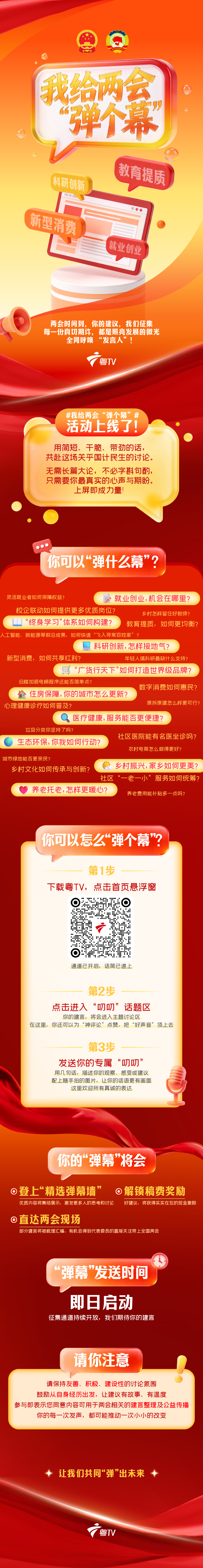 在代表委员们赴京履职之际,粤TV为网友和代表们搭建起了民意表达与政策传播的双向互动桥梁。网友们通过“我给两会‘弹个幕’”融媒策划活动,正在与代表委员就热点话题实时互动。代表委员们在会场发声,网友在屏前建言——两条声线,同频共振。一条条弹幕,是民意的即时回响,更是线上线下的“双向奔赴”。哪些话题已提前“霸屏”?一起来看这场“指尖上的两会”。