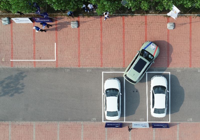 2021世界智能驾驶挑战赛在中国天津举行,参赛车辆在参加自动泊车比赛。新华社发