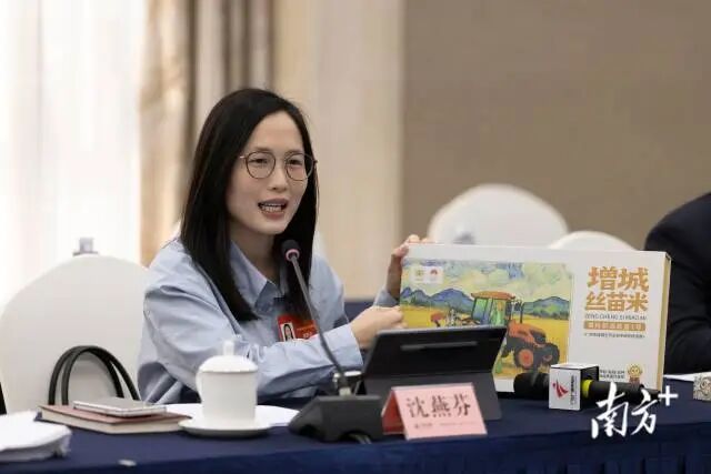 全国人大代表沈燕芬在两会期间介绍增城丝苗米。