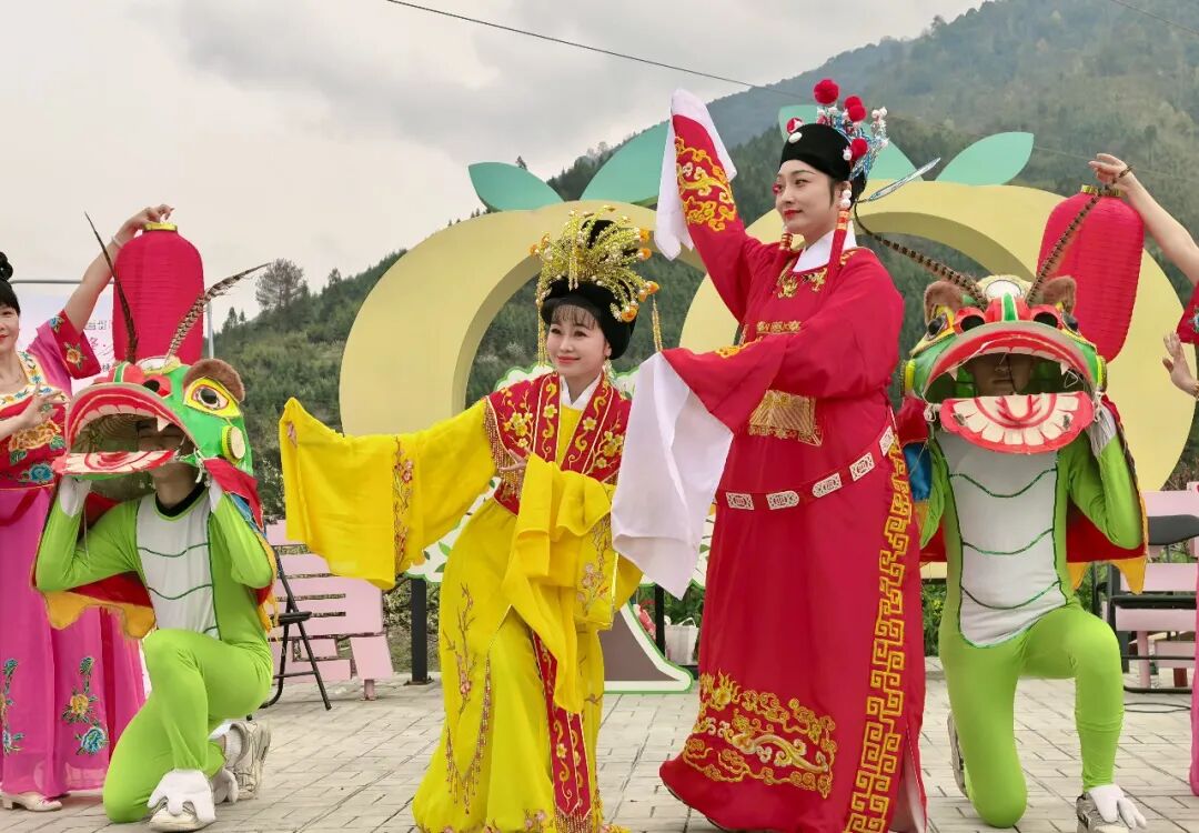 今年的活动打破了“走马观花”的传统模式,以万亩花海为天然背景,深度融合本土文化。在花田间,原生态的九峰山歌婉转悠扬,客家唱腔与春风交织,让游客在赏景之余,沉浸式感受非遗的独特魅力。不远处,憨态可掬的青蛙狮灵动起舞,送上吉祥;“乐昌公主”在花丛中翩然起舞,引得游客纷纷驻足围观、合影留念;书法爱好者则在花间挥毫泼墨,以笔墨定格春色;五彩斑斓的灯谜随风摇曳,游客们或凝神思索,或三五讨论,在智慧比拼中收获意外的惊喜与乐趣。一步一景,皆是文化的韵味。
