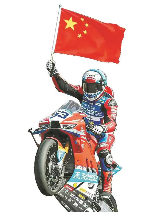 法国车手瓦伦丁·德比斯驾驶张雪机车的820RR-RS赛车夺得WSBK葡萄牙站WorldSSP组别冠军,赛后高举五星红旗庆祝 张雪机车供图