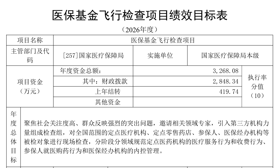 2026年,国家医保局安排3268.08万元预算用于医保飞检项目,聚焦社会关注度高、群众反映强烈的突出问题,邀请相关领域专家、引入第三方机构力量组建检查组,对全国范围内的定点医疗机构、定点零售药店、参保人、医保经办机构等开展现场检查,分阶段、分领域规范各方基金使用行为。
