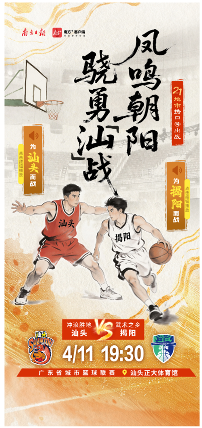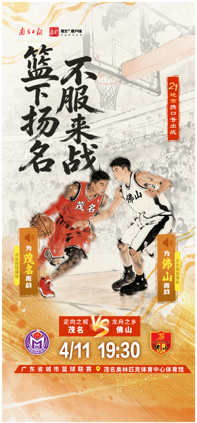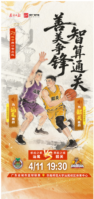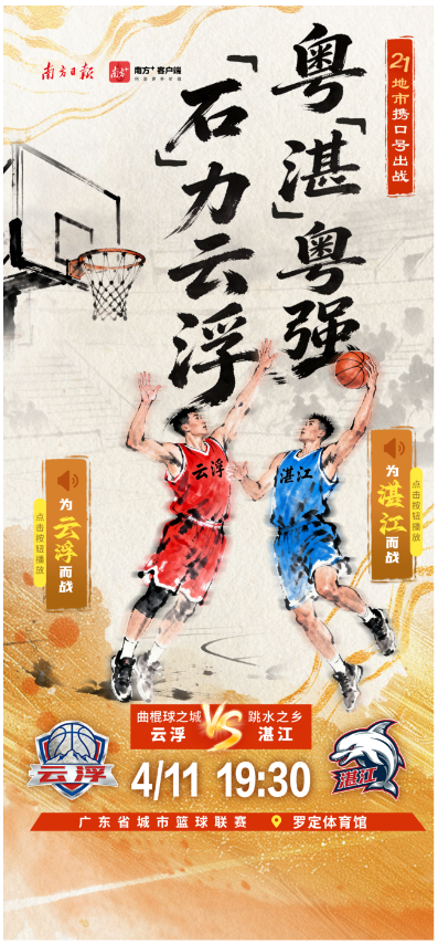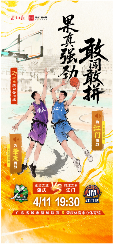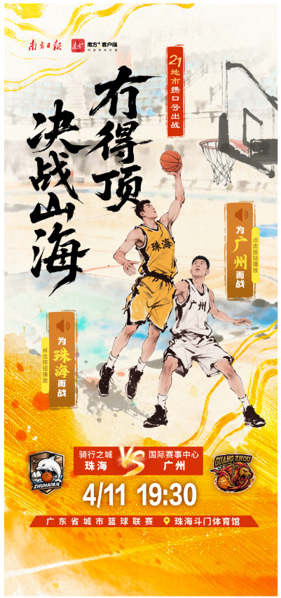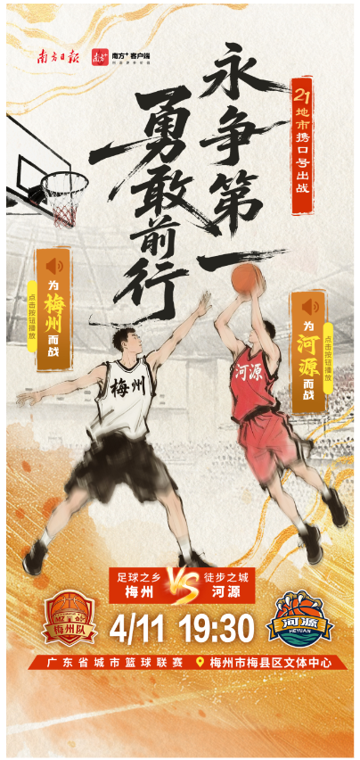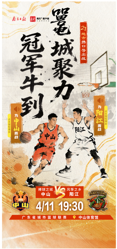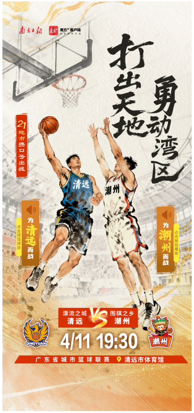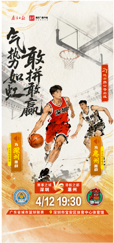 4月11日,2026年广东省城市篮球联赛第三轮比赛将正式开打。各地市携城市口号出战,快点击海报中的小喇叭,喊出主场的口号,为自己的主场打call吧。