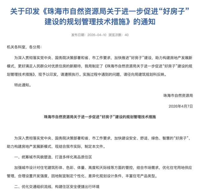4月10日,珠海市自然资源局发布《珠海市自然资源局关于进一步促进“好房子”建设的规划管理技术措施》,为珠海“好房子”划定13条标准,涵盖城市风貌塑造、宜居空间打造、完善公共配套、建筑设计提质、居住创新探索、存量品质升级等方面。