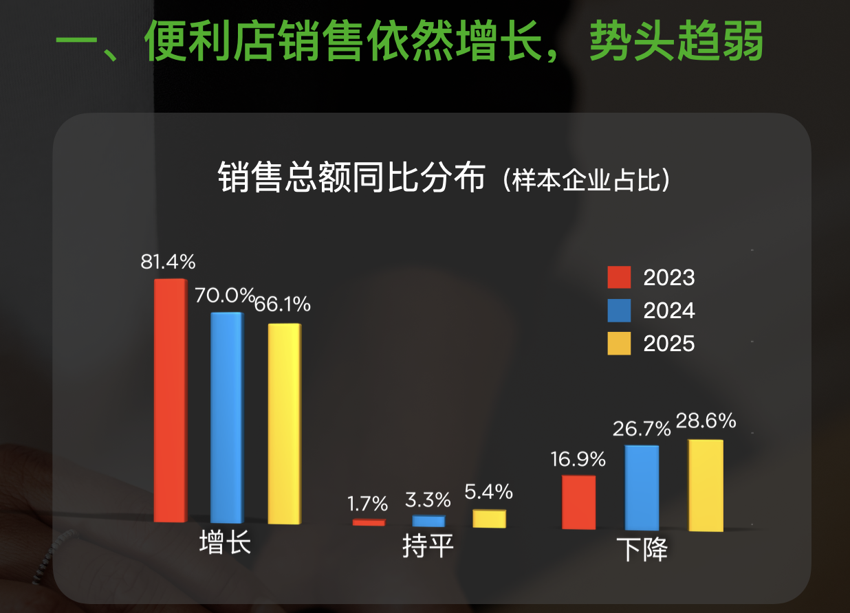 即便是销售额,行业整体增长速度亦在放缓。从下图可以看到,2023年、2024年、2025年,销售额同比增长的便利店比例分别为81.4%、70%、66.1%,下降明显;与之对应,销售额下降的便利店占比,从16.9%上升至28.6%,几近翻倍。