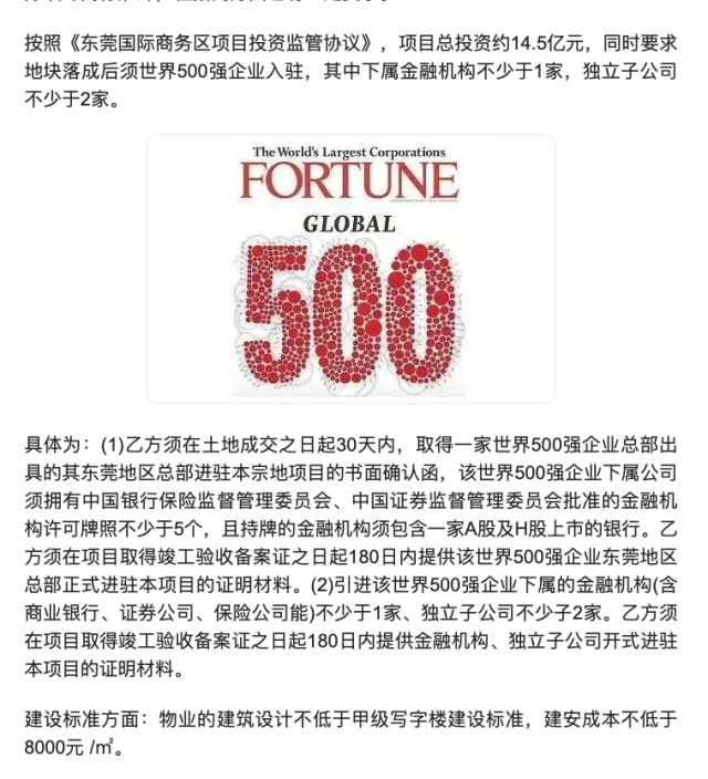 此外,各地块对招商也进行了严格要求,如招商湾熙中心明确要求,须引进世界500强企业下属的金融机构(含商业银行、证券公司、保险公司等)不少于1家、独立子公司不少于2家,聚焦高端金融领域;东莞香港中心重点布局莞港协同,须引入地市级外商投资协会机构、香港医疗中心,以及5家及以上香港上市(上市时间5年以上)公司的分公司或子公司、20家及以上在东莞注册10年以上的港资企业分公司或子公司,同时集聚高端国际化服务业机构,打造莞港合作示范窗口。