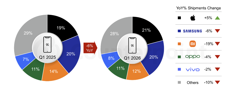 根据Counterpoint Research Market Monitor的初步数据,2026年第一季度全球智能手机市场持续承压,出货量同比下滑6%。IDC最新发布的《全球季度手机跟踪报告》则显示,全球智能手机出货量同比下降4.1%,至2.897亿部,并“打破了自2023年年中以来市场连续十个季度的增长势头”。