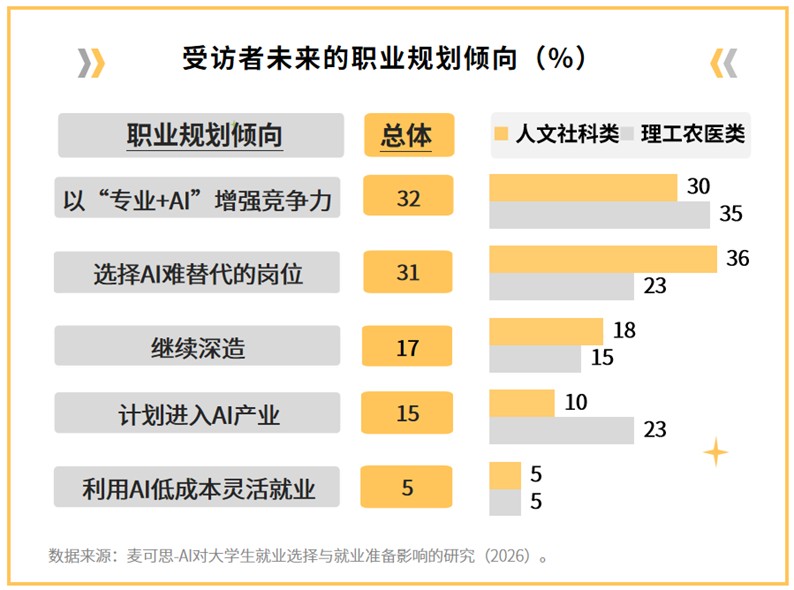 麦可思研究院的调查面向数千名在校大学生、应届毕业生、毕业三年内的往届生展开,调查显示,在认为“AI对未来就业市场影响大”的受访者中,69%的理工农医类专业受访者认为AI对未来就业市场影响明显,而只有43%的人文社科类专业受访者有此感受。