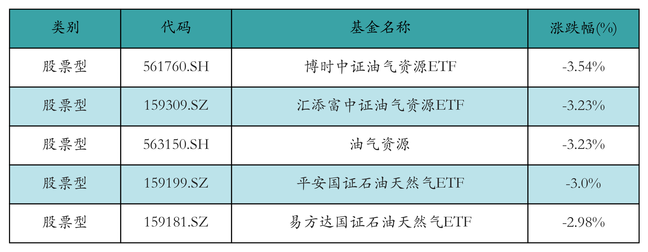 上周股票型ETF跌幅最大的5只ETF及其收益率分别为:博时中证油气资源ETF(-3.54%)、汇添富中证油气资源ETF(-3.23%)、油气资源(-3.23%)、平安国证石油天然气ETF(-3.0%)、易方达国证石油天然气ETF(-2.98%)。详情见下表: