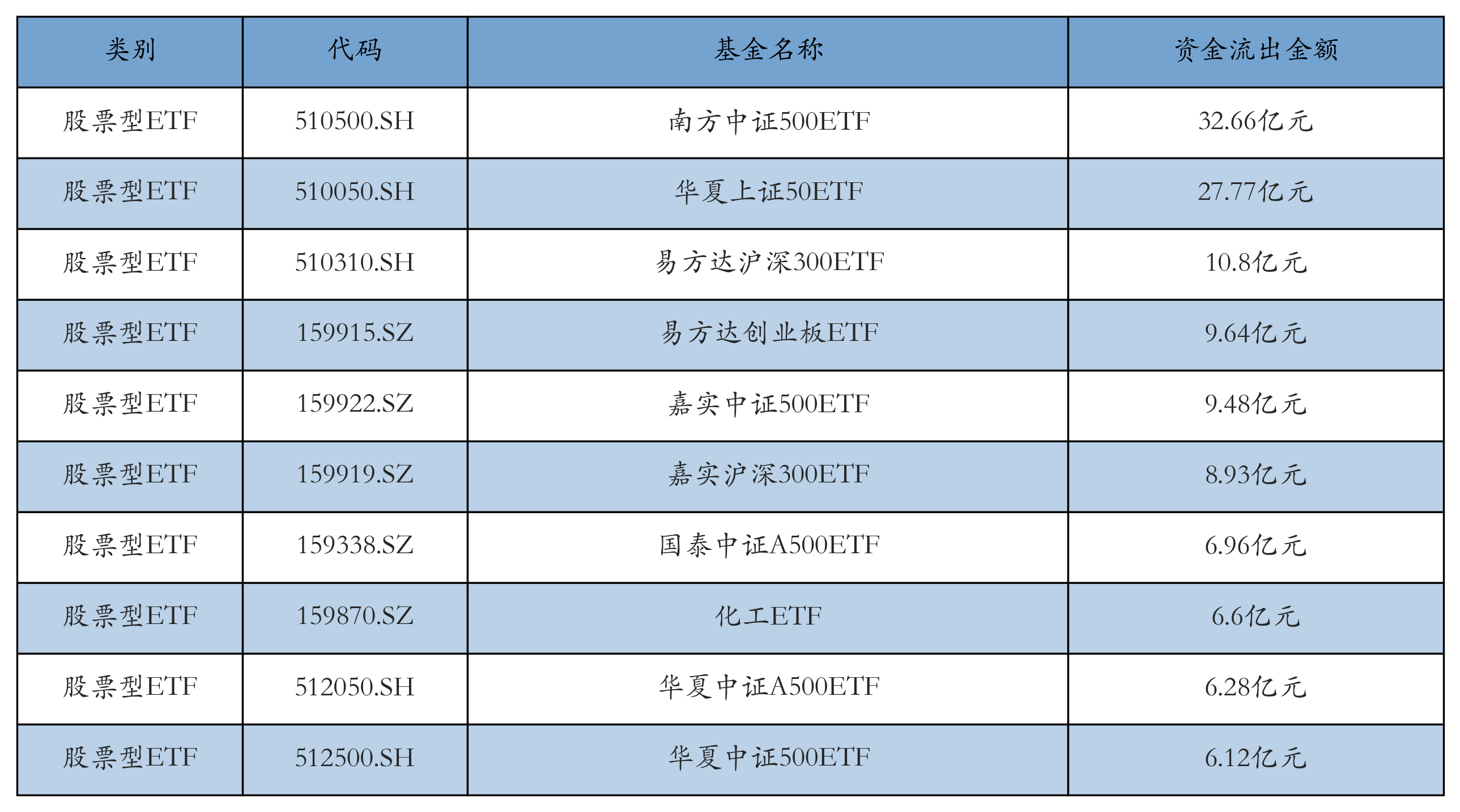昨日股票型ETF资金流出最多的3只ETF及其流出金额分别为:南方中证500ETF(流出32.66亿元)、华夏上证50ETF(流出27.77亿元)、易方达沪深300ETF(流出10.8亿元)。资金流出前10详情见下表: