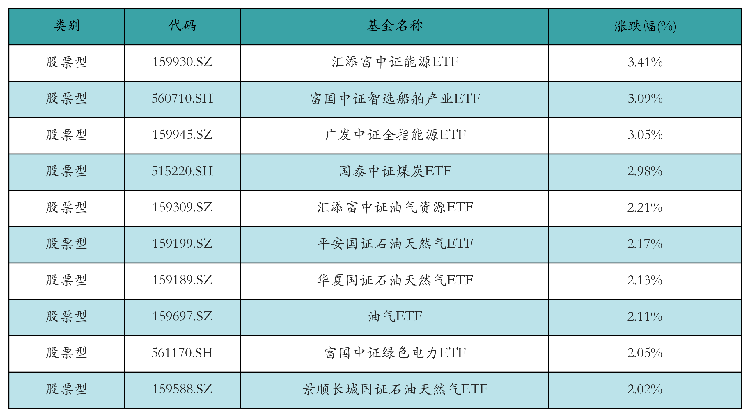 昨日股票型ETF涨幅最高的3只ETF及其收益率分别为:汇添富中证能源ETF(3.41%)、富国中证智选船舶产业ETF(3.09%)、广发中证全指能源ETF(3.05%)。涨幅前10详情见下表:
