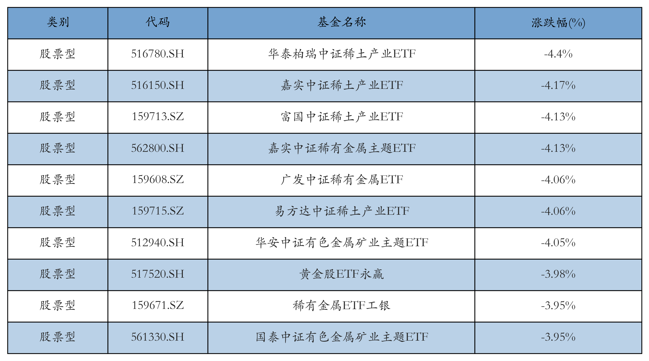 昨日股票型ETF跌幅最大的3只ETF及其收益率分别为:华泰柏瑞中证稀土产业ETF(-4.4%)、嘉实中证稀土产业ETF(-4.17%)、富国中证稀土产业ETF(-4.13%)。跌幅前10详情见下表: