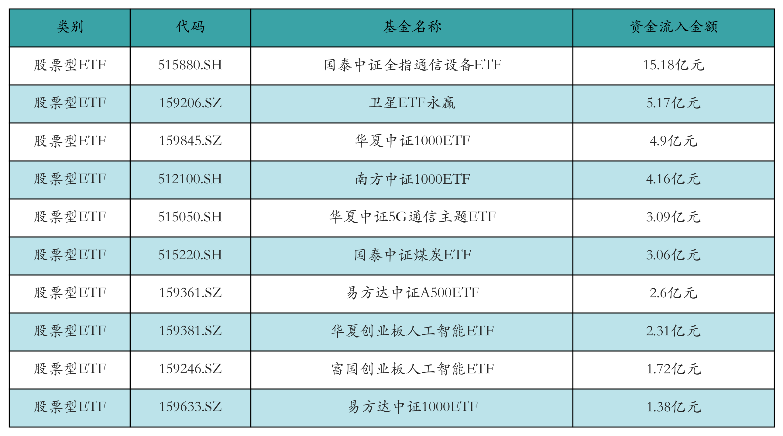 昨日股票型ETF资金流入最多的3只ETF及其流入金额分别为:国泰中证全指通信设备ETF(流入15.18亿元)、卫星ETF永赢(流入5.17亿元)、华夏中证1000ETF(流入4.9亿元)。资金流入前10详情见下表: