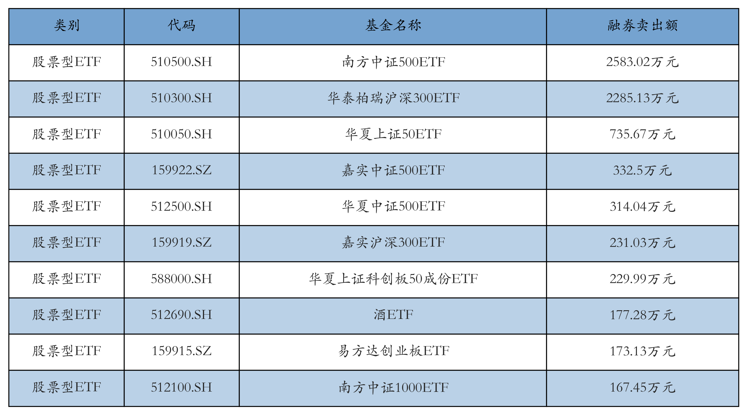 昨日股票型ETF融资卖出额最高的3只ETF及其卖出金额分别为:南方中证500ETF(2583.02万元)、华泰柏瑞沪深300ETF(2285.13万元)、华夏上证50ETF(735.67万元)。融券卖出额前10详情见下表: