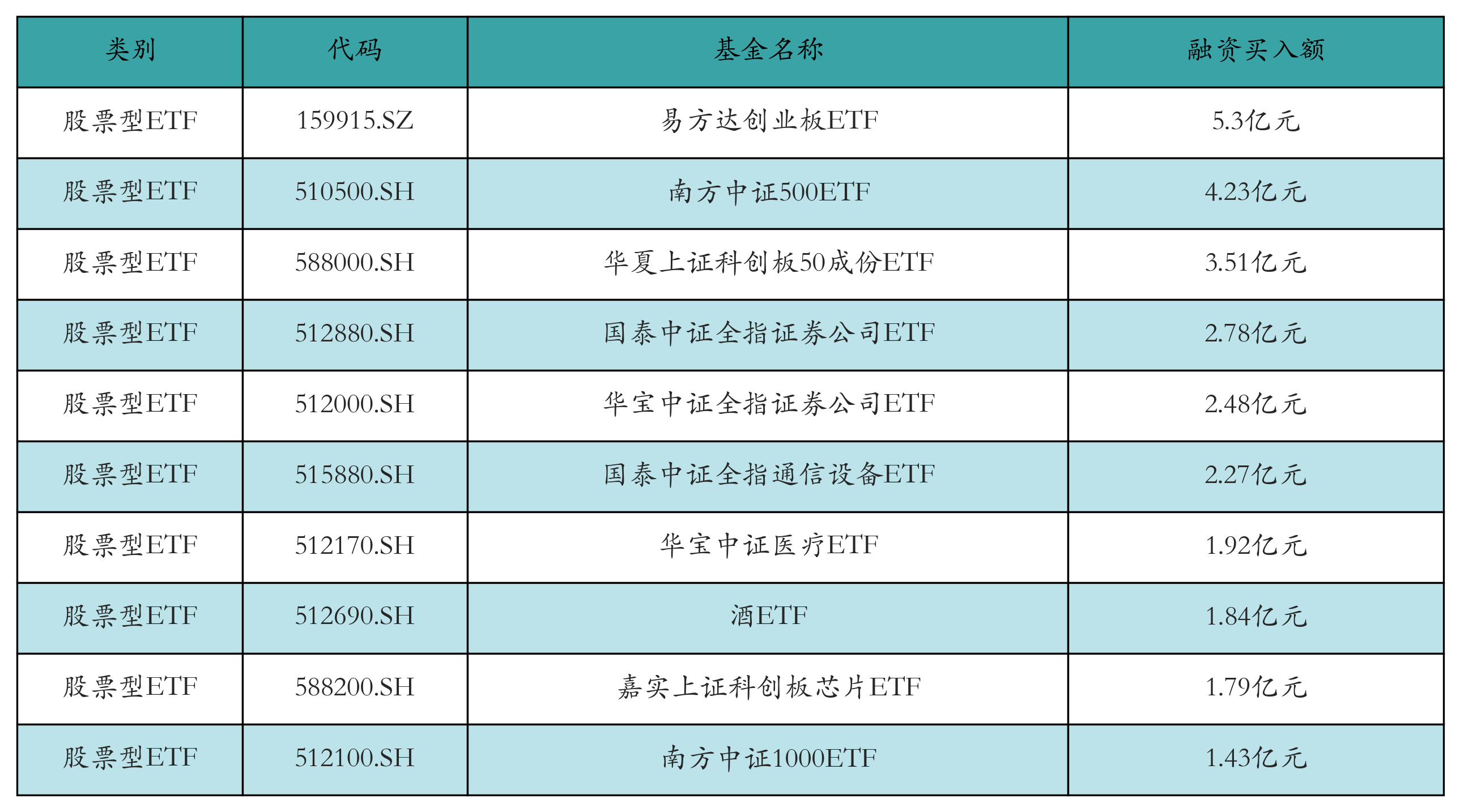 昨日股票型ETF融资买入额最高的3只ETF及其买入金额分别为:易方达创业板ETF(5.3亿元)、南方中证500ETF(4.23亿元)、华夏上证科创板50成份ETF(3.51亿元)。融资买入额前10详情见下表: