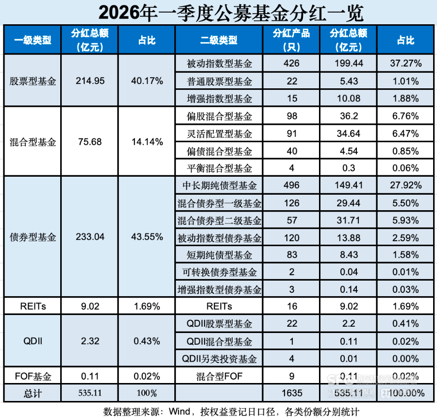 Wind数据显示,2026年一季度公募基金分红总额达535.11亿元,权益基金分红占比从两年前的11%飙升至54%,而债基分红占比则从两年前88%腰斩至44%。一场分红格局的历史性逆转正在发生。