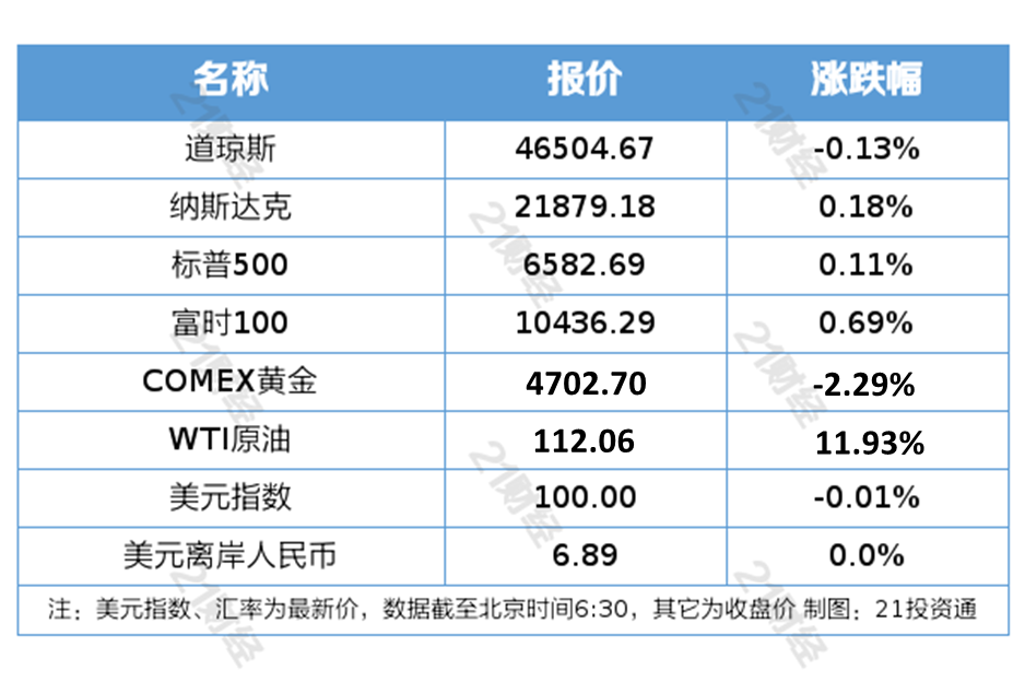 1、4月2日,美股三大指数收盘涨跌不一,道指跌0.13%,纳指涨0.18%,标普500指数涨0.11%;科技股涨跌互现,英特尔涨超4%,AMD、奈飞涨超3%,特斯拉跌超5%并创去年11月以来最大单日跌幅。中概股涨跌不一,纳斯达克中国金龙指数跌0.34%。国际油价大幅收涨,美油主力合约收涨11.93%,报112.06美元/桶;布油主力合约涨7.84%,报109.09美元/桶。国际贵金属期货普遍收跌,COMEX黄金期货跌2.29%报4702.70美元/盎司,COMEX白银期货跌3.82%报73.17美元/盎司。